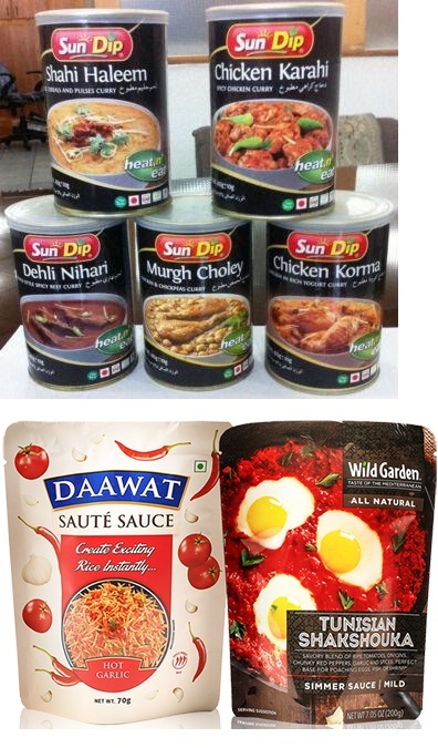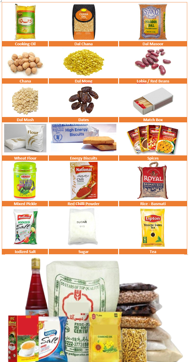 Emergency Ramadan food hampers: cooked, uncooked, and canned options.