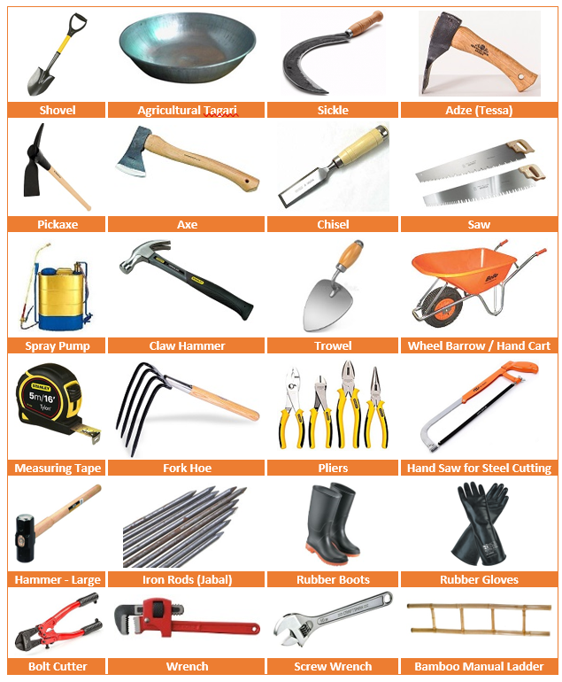 A variety of tools, varying in type and size, are used for agricultural tasks and shelter repairs.